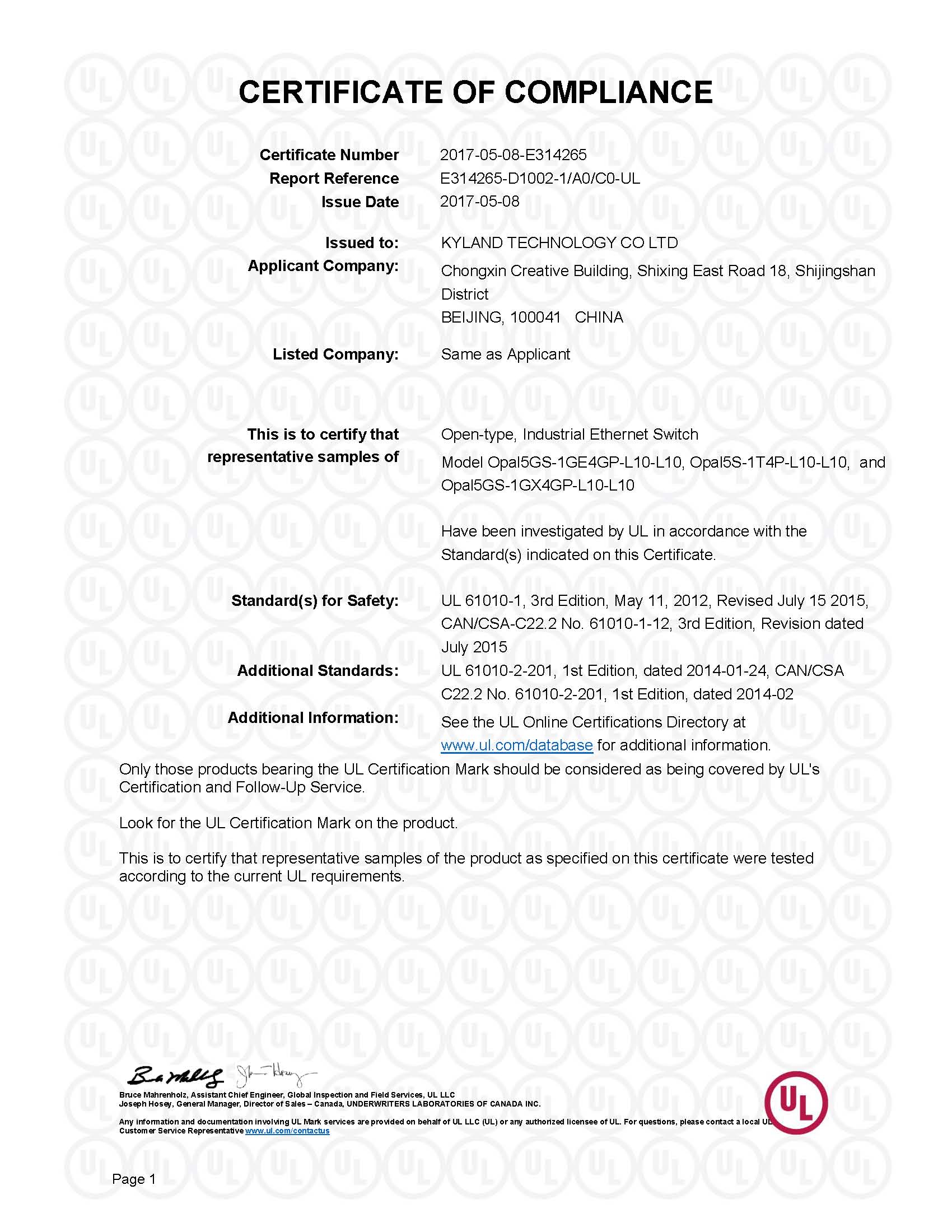 UL61010 Certification_E314265_OPAL5,OPAL8,OPAL20_24VDC(24VAC)